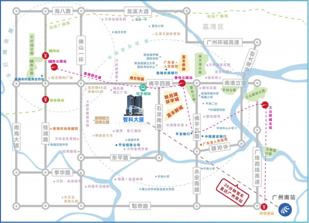 智科大厦地处南海桂城映月湖板块佛山总部经济集聚区黄金位置,该区域是南海区委区政府和桂城街道着力打造的高科技总部经济商务圈,是广东金融高新区和广州南站经济圈的黄金交汇点,5分钟即达广州荔湾、番禺,跨越广佛双城,坐享广佛双城融合发展带来的海量信息流、物流、资金流等,以及数以亿计的庞大客流、人才流集城市品质、公共配套、人才聚集和区位优势于一身。